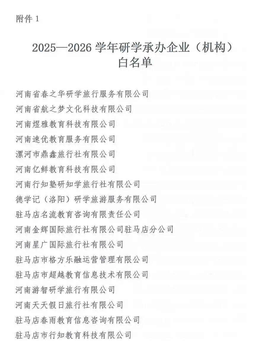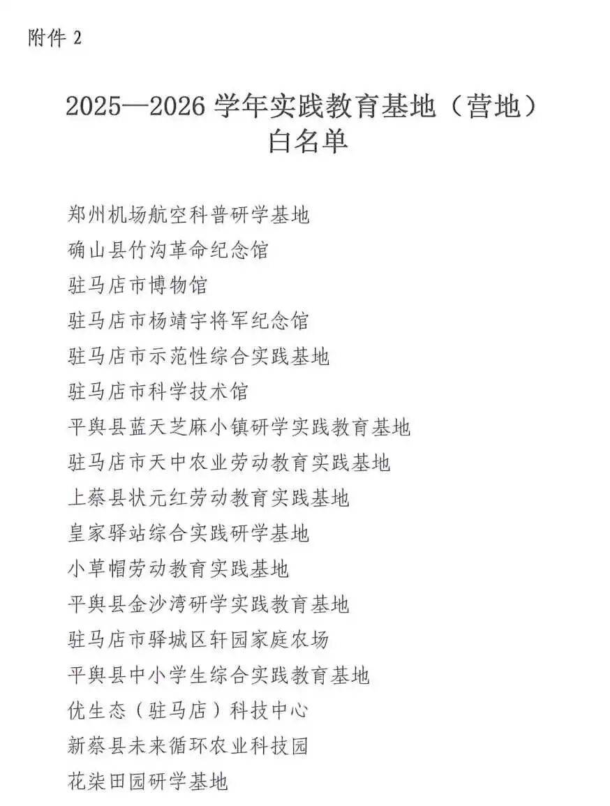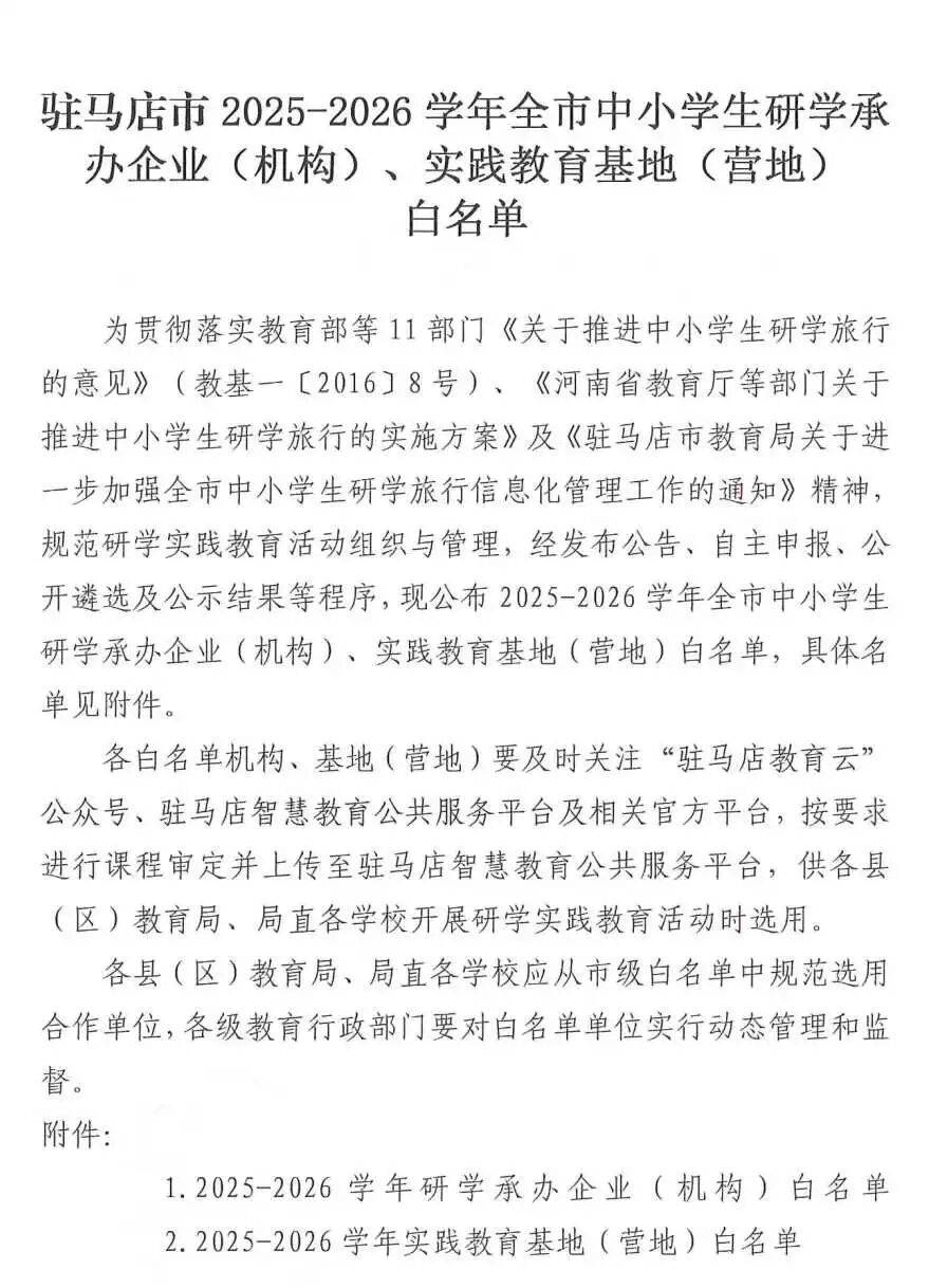 驻马店市教育局关于印发《驻马店市2025-2026学年全市中小学生研学承办企业(机构)、实践教育基地(营地)白名单》的通知